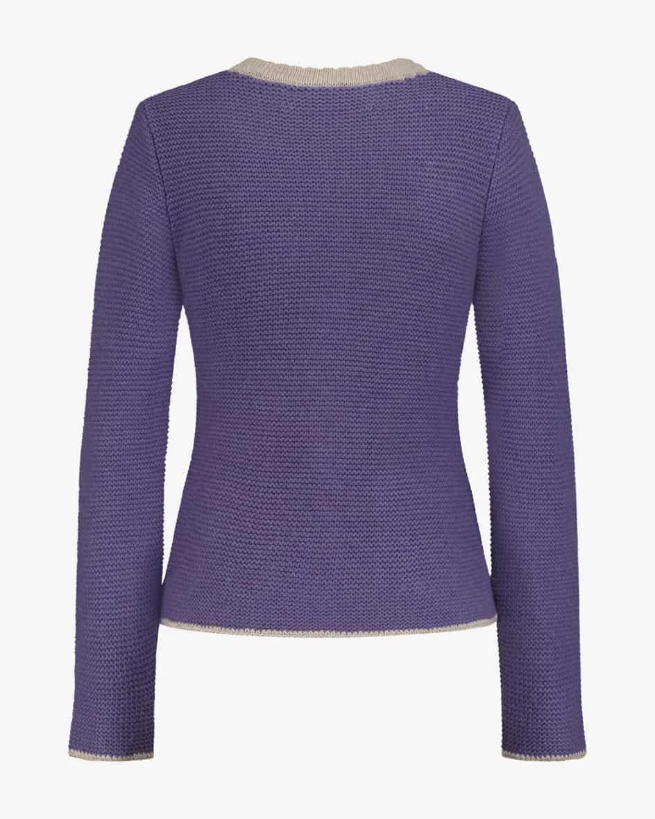 während das feine Strick-Muster, modische Kontrastpaspeln sowie Knöpfe in