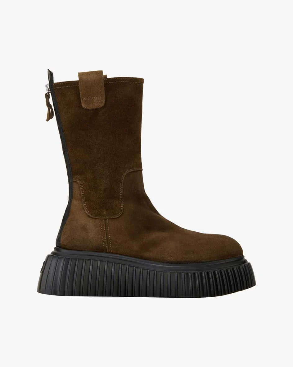 Plateau-Sohle mit modernem Charme, während die Veloursleder-Verarbeitung das