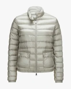 Lans Daunenjacke für Damen von Moncler in Hellgrau. Das antaillierte Modell